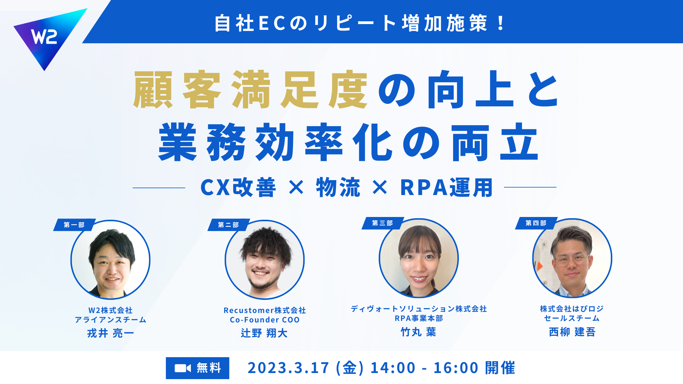 購入体験プラットフォーム「Recustomer(リカスタマー)」を運営するRecustomer株式会社(本社:東京都千代田区、代表取締役:柴田 康弘)のCo-Founder COOの辻野が、W2株式会社(本社:東京都中央区、代表取締役 CEO:山田 大樹)が主催するウェビナーに登壇いたします。ECサイトにおける、リピート率向上の具体的な施策についてお話しいたします。