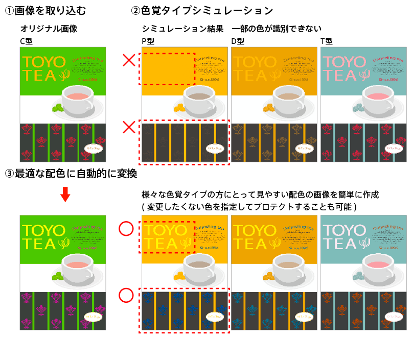 | 主な機能 | ・画像データ(TIFF、JPEG、BMP、GIF、PNG)の読み込み ・色覚タイプ同時シミュレーション (1(P)型2色覚、2(D)型2色覚、3(T)型2色覚) ・識別しづらい色の組合せを警告 ・識別しやすい色への自動変更 ・変換後のデータ保存 ・Dither オプション(色変更せずにパターンで見やすい画像に変換) |