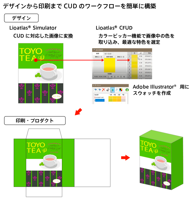さらにLioatlas® Simulatorで変換後の画像の色を、同シリーズのCUD配色ソフト「Lioatlas® CFUD」に取り込み近似の特色を選定することで、印刷時の色指定をすることができます。これにより、デザインからプロフェッショナルな印刷まで、カラーユニバーサルデザインのワークフローを簡単に構築することが可能になり、色彩のバリアフリー実現に寄与いたします。