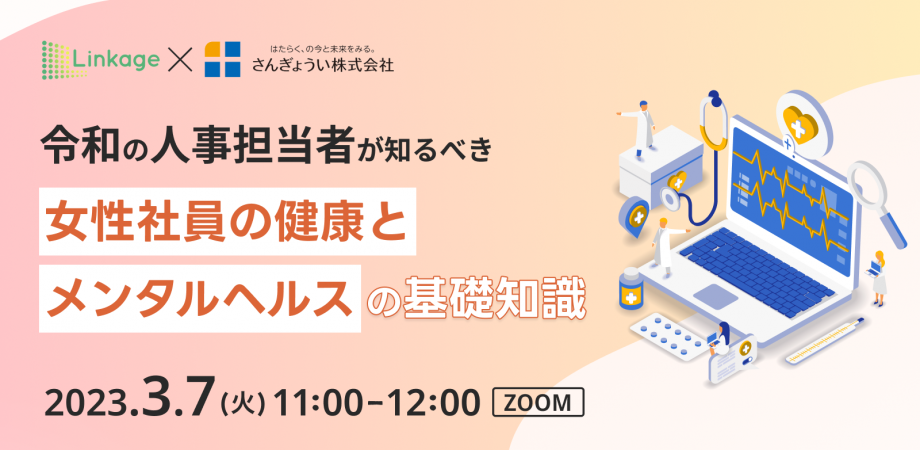 予防医療テックでオンライン診療など健康支援プログラムを提供する株式会社リンケージ(本社:東京都中央区、代表取締役社長:生駒恭明)は、2023年3月7日(火)11時より、さんぎょうい株式会社(本社:東京都新宿区、代表取締役社長:芥川奈津子)と共同で無料セミナー「令和の人事担当者が知るべき 女性社員の健康とメンタルヘルスの基礎知識」を開催します。