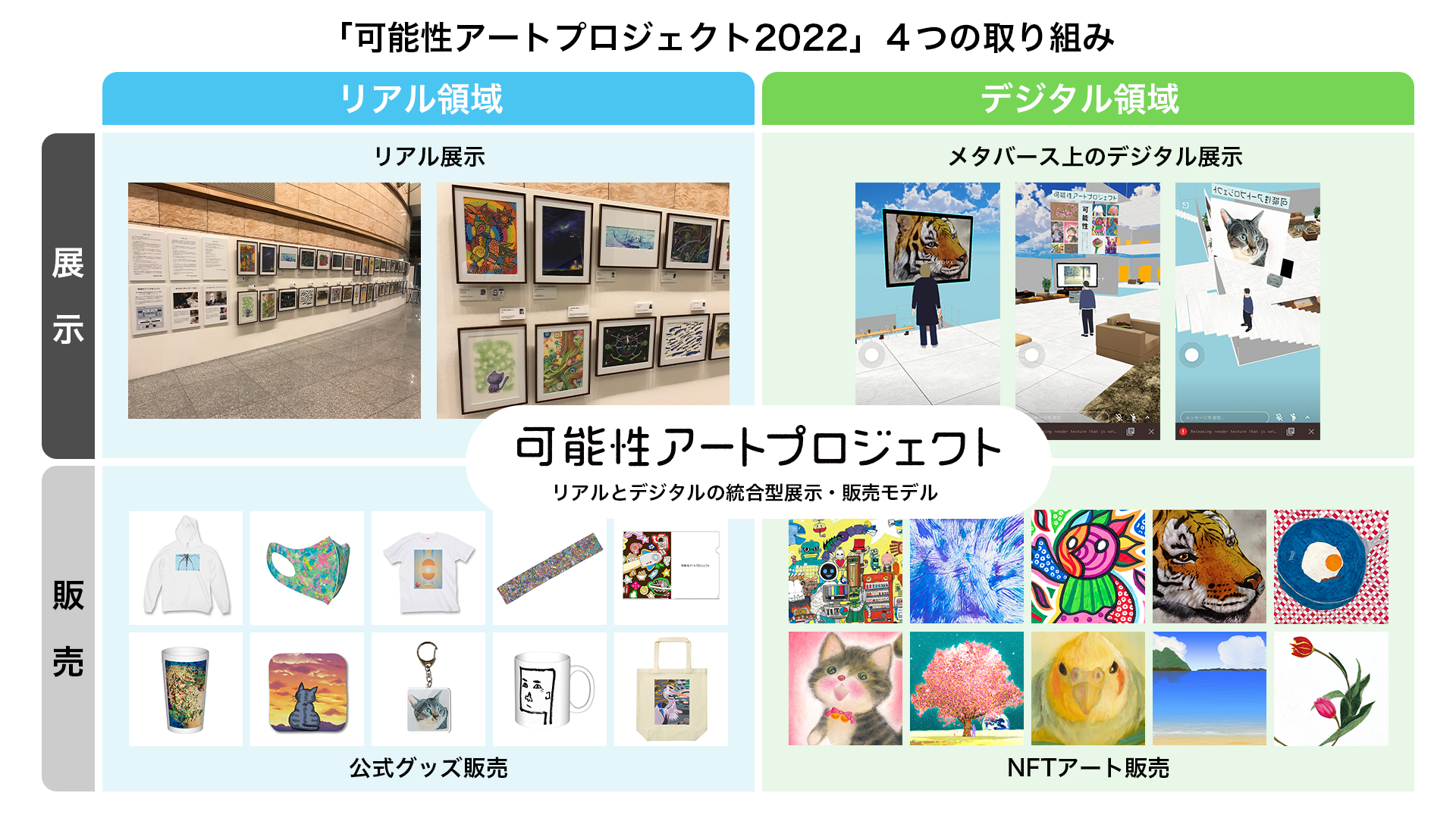 このたび、新型コロナウイルス感染拡大をうけて延期していたリアル展示での「可能性アートプロジェクト展 2022」を、2022 年 6 月 28 日(火)から 9 月 30 日(金)まで、トッパン小石川本社ビル 1F エントランスで開催します。展示作品は、「プリマグラフィー®」により額装して展示し、障がい者アート協会のホームページより販売するとともに、今回展示される作品がデザインされたグッズも「かなプロマーケット®」にて販売します。