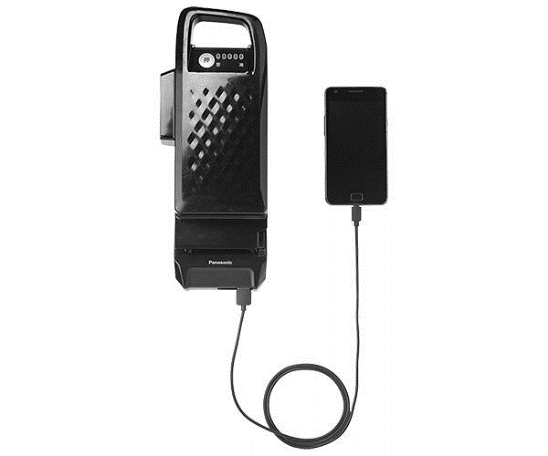 電動アシスト自転車用バッテリーに装着するだけでUSB経由での給電が可能。16 Ahバッテリーを使用の場合、スマートフォン(容量:約3,000 mAh相当)を約20回充電できる(モバイルバッテリーと同等の3.6 V換算した場合、約112,000 mAhに相当)