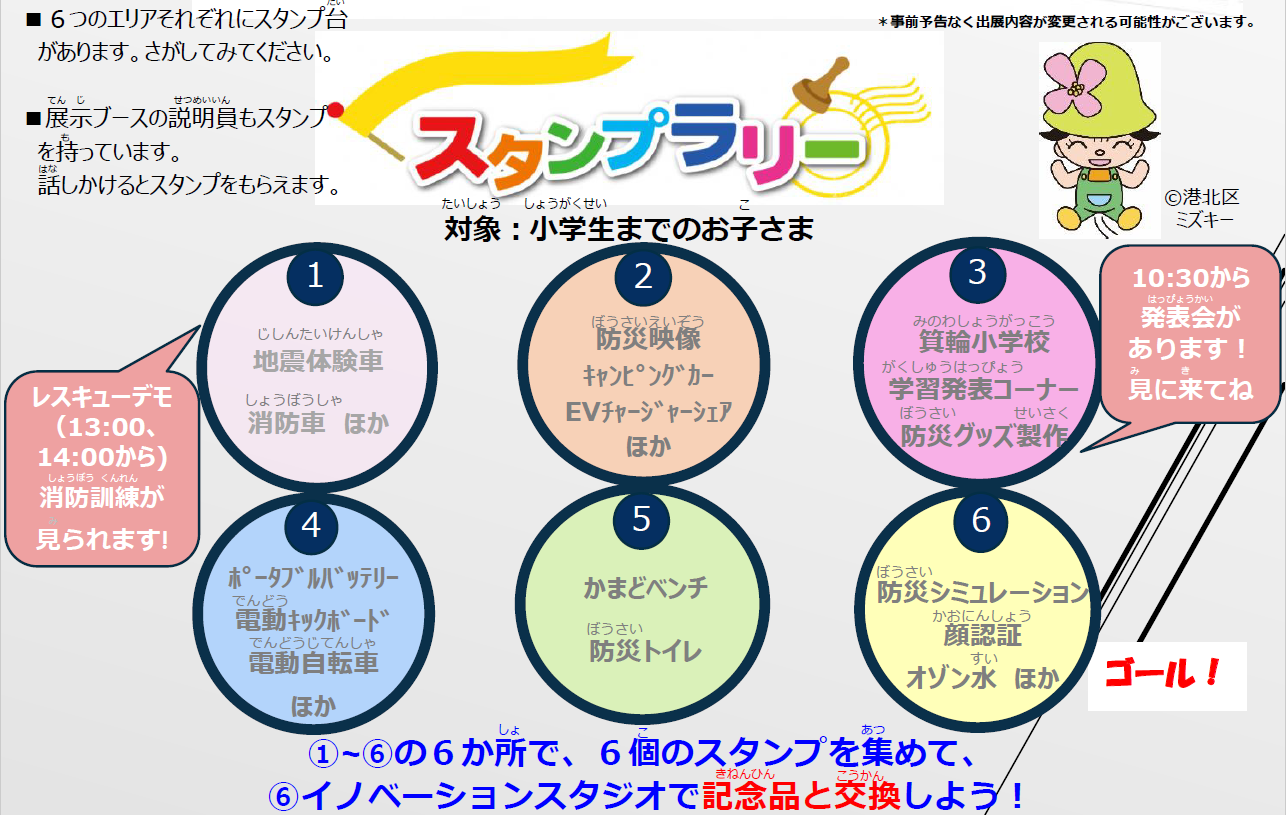 アピタテラス横浜綱島の「屋上駐車場」と1階「イートイン」、同施設裏手の「バックヤード」、交流・共創拠点である「イノベーションスタジオ」、スタジオに続く「貫通通路」、そしてTsunashima SSTの「外周」の6つのエリアを会場とし、港北区、近隣小学校、協議会各社、他近隣の企業など約20団体が防災に関連したブース出展を行います。