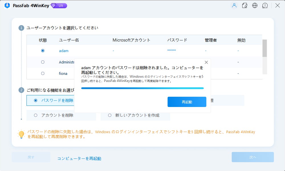 Step7:Windowsパスワードが削除されますので、「再起動」をクリックします。