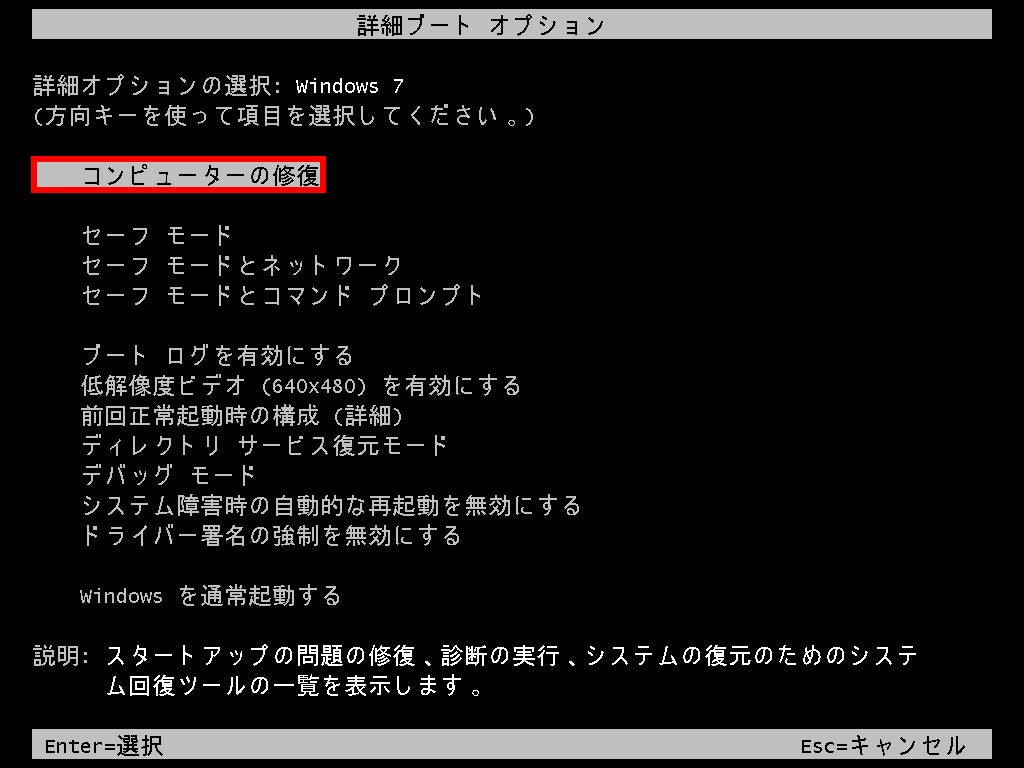Step1:パソコンの起動時に「F8」キーを連続して押して詳細ブートオプションを開き、「コンピューターの修復」をクリックします。