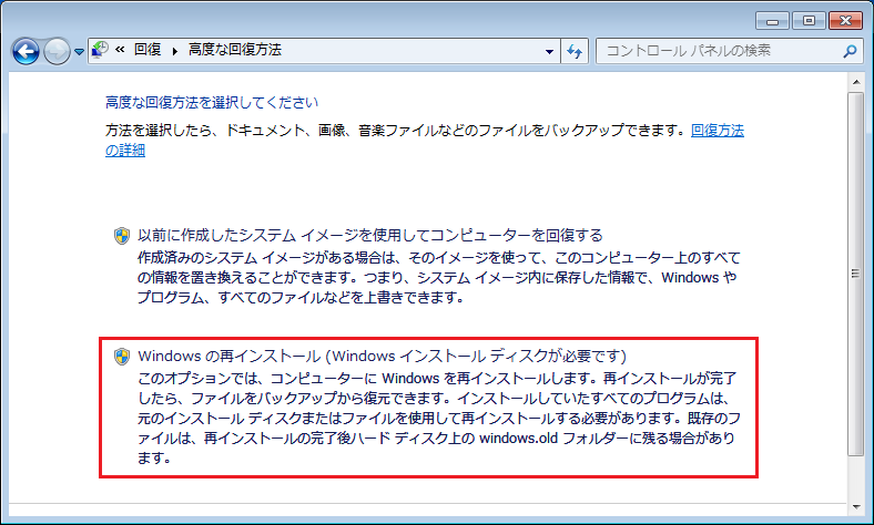 Step4:「Windowsの再インストール(Windowsインストール ディスクが必要です)」をクリックします。