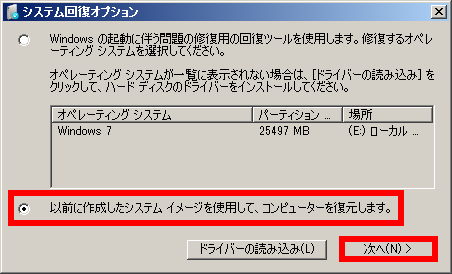 Step4:「以前に作成したシステムイメージを使用して、コンピューターを復元します。」にチェックを入れて「次へ」をクリックします。適用したいシステムイメージを復元してWindows7を工場出荷時に戻します。