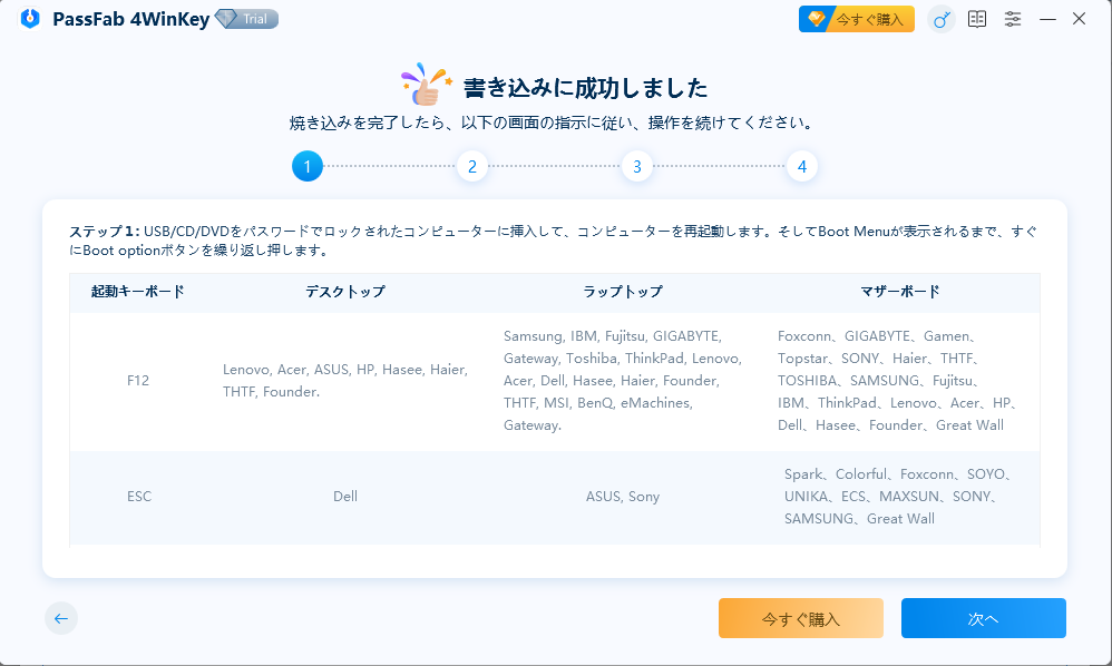 Step4:作成が完了した起動メディアをWindowsパスワードを削除したいパソコンに挿入して、ブートメニューからWindowsシステムを起動します。