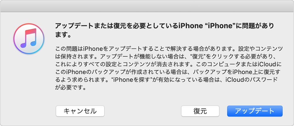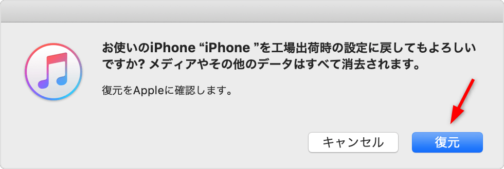 Step3:iTunesにメッセージが表示されたら、「復元」を選択します。