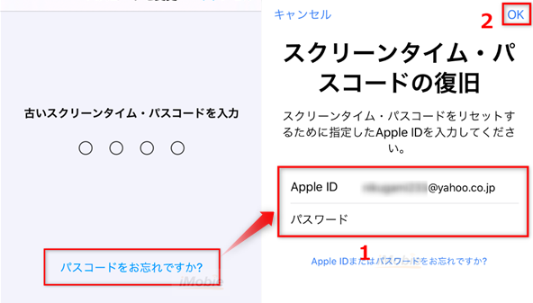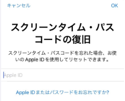 Step3:「パスコードをお忘れですか?」をタップして、スクリーンタイム・パスコードの初期設定で入力したApple ID とパスワードを入れます。