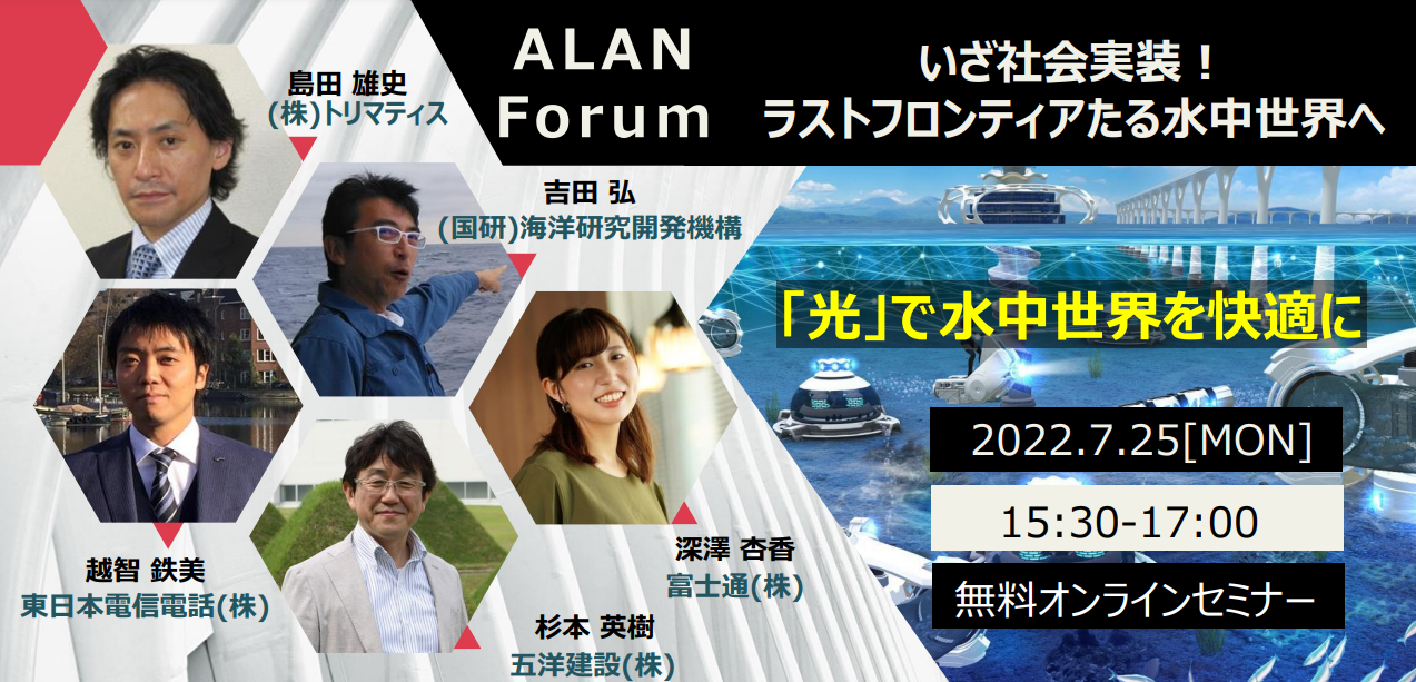 水中光技術の活用を通じた新市場創出・社会課題解決を目指すALANコンソーシアムでは昨年、1Gbps×100m超高速海中光ワイヤレス通信の成功(*1)、水中LiDAR小型化・高速化を実現(*2)しました。今後、技術の社会実装に向けて、海洋産業の現状課題に対する具体的なアプローチを始動します。本フォーラムでは、新規設立のワーキンググループのご紹介に加え、本コンソーシアムメンバー団体が期待する社会実装像と、その期待に応える新たなビジネスモデルをご紹介します。