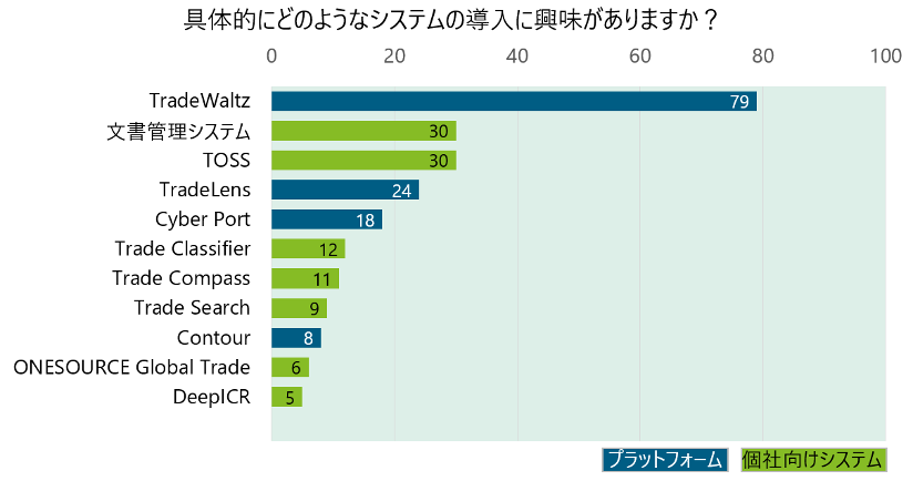 4年間の開発期間を経て、今年製品リリースされた貿易プラットフォーム「TradeWaltz」は、「紙書類をベースとしたアナログ貿易」で苦しむ貿易実務者の皆様から、過去1年で1,000社以上のお問合せや50社のトライアル利用を頂くなどして、少しずつ認知をして頂きました。また先日6月23日にデロイト トーマツ税理士法人が「貿易実務者完全電子化ウェビナー」で発表したデータ(下図)によると、貿易実務者が今後利用したいと考えるサービスとしても高い期待を寄せて頂いております。