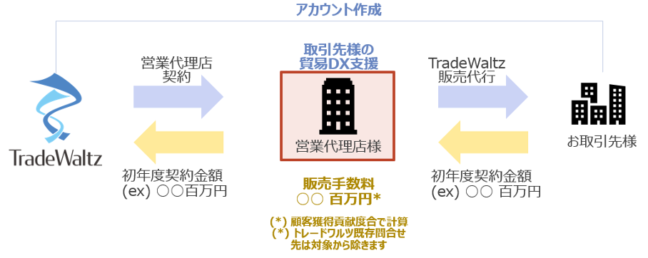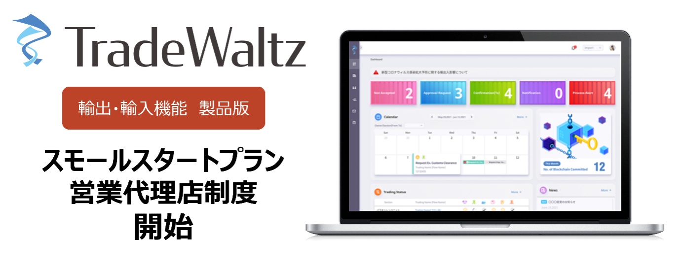 また弊社では並行してコンサルティングファーム、システムインテグレーター、貿易サービス事業者、地方銀行などより「取引先からも問い合わせを受けることが増えたので、自社のサービスに組み込んでTradeWaltzを販売したいが、販売手数料をもらえないか」 といった問合せが増えてきたほか、荷主・物流会社・銀行・保険会社からも「数社取引先をお客様として紹介するので利用料金を割引できないか」といったお問合せも頂き、個別にお話をさせて頂いておりましたが、今回営業代理店パートナー制度として確立し、公式に募集を開始します。