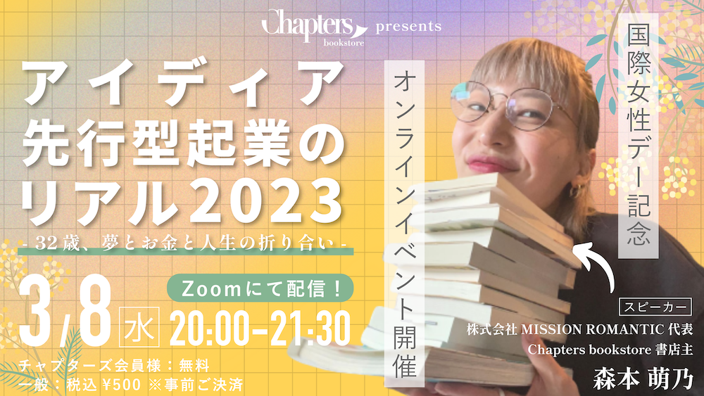 2019年起業、コロナ禍真っ只中に自宅を拠点にサービスを開始したChapters書店主・株式会社MISSION ROMANTIC代表の森本萌乃が、女性の生き方を考える日「国際女性デー」を記念しオンラインイベントを開催します。