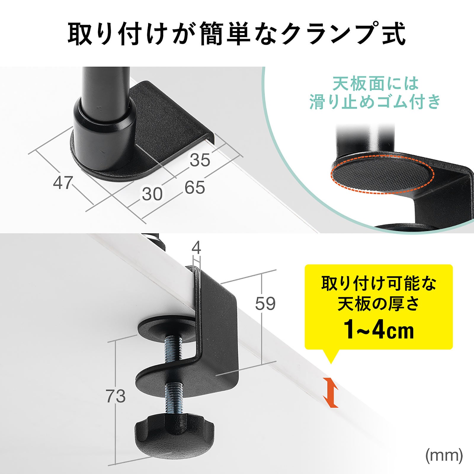 クランプ取り付けの為、書籍や資料を浮かすことができるので、机上を広く使用することができます。取り付けが簡単なクランプ式は、天板厚1cm~4cmまでに対応しています。