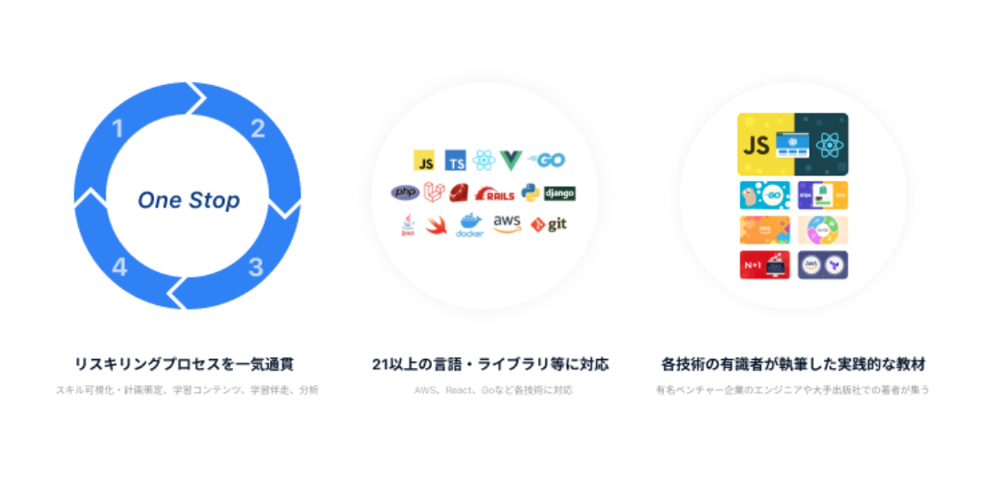 「Techpit for Enterprise」では、学習プログラムの提供だけでなく、人材育成計画の策定から学習の完了支援まで、「リスキリング」に必要なプロセスを一気通貫で支援します。スキルアセスメントを受講することで、学習者の現在の理解度をチェックし、各個人の理解度に応じた最適なリスキリングプラン、学習コンテンツを提供します。
