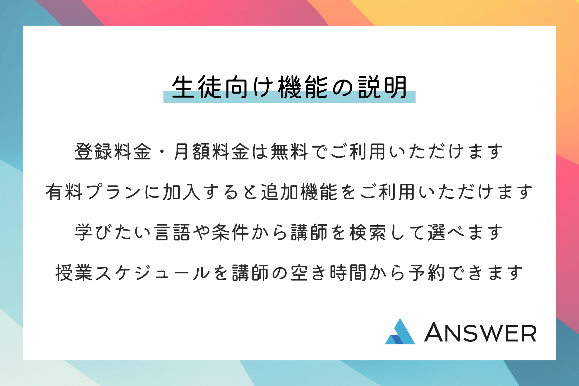 Answer makes teacher information visible so that students can find the right teacher for them. You can check the teacher’s profile, lesson contents, and fees at a glance. Meet the teacher who is right for you and learn efficiently.