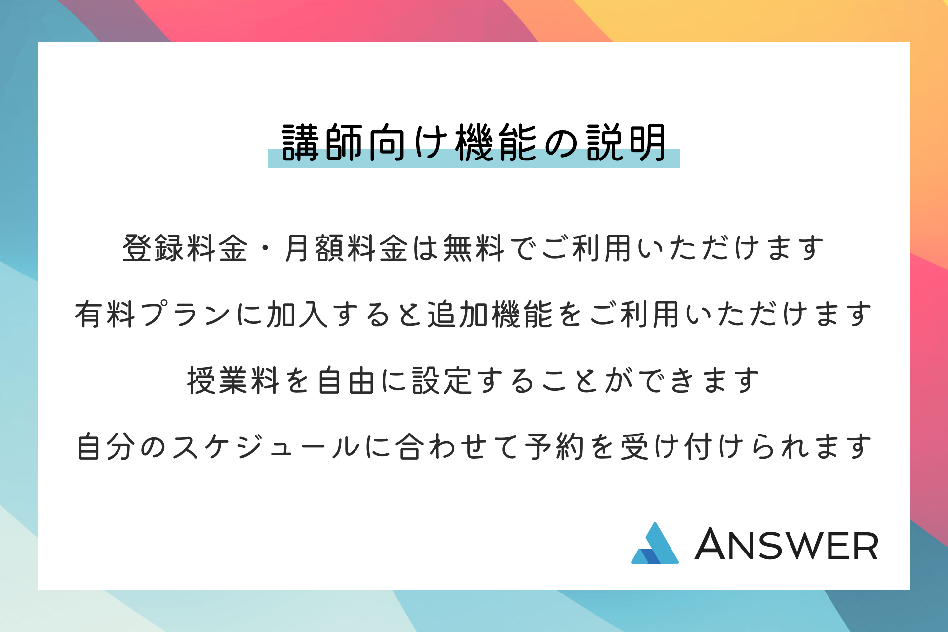 Answerは、生徒の皆様が自分に合った先生を見つけられるよう、先生の情報を見える化しています。先生のプロフィールやレッスンの内容、料金などを一目で確認することができます。自分に合った先生と出会い、効率的な学習を実現しましょう。