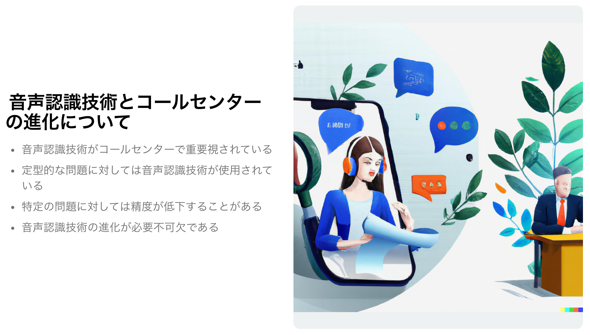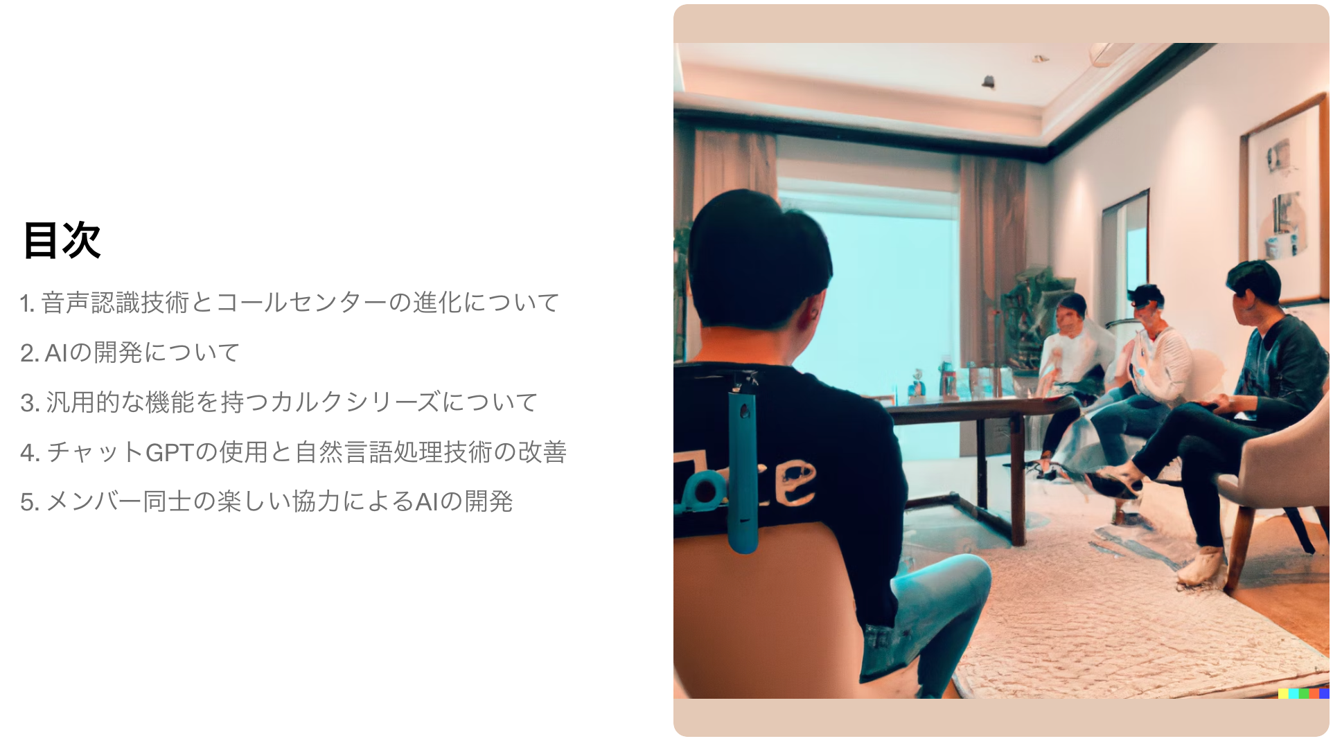 *以下は1時間のMTGの内容をChatGPT、Whisper、DALL·Eを利用し出力したスライドの一部