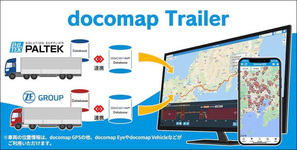 この度の、PALTEKとゼット・エフ・ジャパンが展開するサービスとの連携を行ったことで、電源供給が難しかったトレーラの位置情報を取得し、DoCoMAP上で確認することが可能になります。さらにDoCoMAPの機能を活用して稼働率の改善や業務効率化を目指すことも可能です。