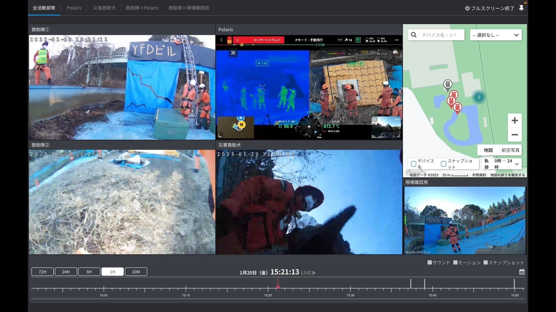 特に、上空から災害現場全体の流れを把握できるドローンカメラ、設定した位置情報の詳細を知れる定点カメラとの組み合わせにより、消防現場での状況を遠隔からでも具体的に把握することに繋がりました。小規模な土砂崩落を防ぐための実証実験では、ドローンカメラで上空から避難ルートを全体俯瞰しつつ、ウェアラブルカメラを装着した隊員に本部から指示出しし、気になるルートの状況把握を細かく確認するなど、様々な角度の映像データにより適切な判断を下すために必要な情報を得られました。