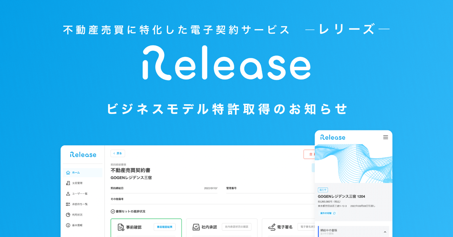 レリーズは物件の登録から引き渡しまでの不動産売買にかかる一連の取引フローにおいて発生する契約手続きを実施いただける、不動産売買特化型の電子契約・契約書管理サービスです。電子署名を実施する書類に加え、捺印が不要な書類や、その他取引にかかる書類も、物件・案件ごとに整理して管理・閲覧・ダウンロードが可能です。これまでの契約書作成業務はそのままに、捺印手続きと書類管理をレリーズに置き換えて取引業務を推進いただけます。今般、このビジネスモデルの新規性、進歩性が認められ、ビジネスモデル特許を取得するに至りました。