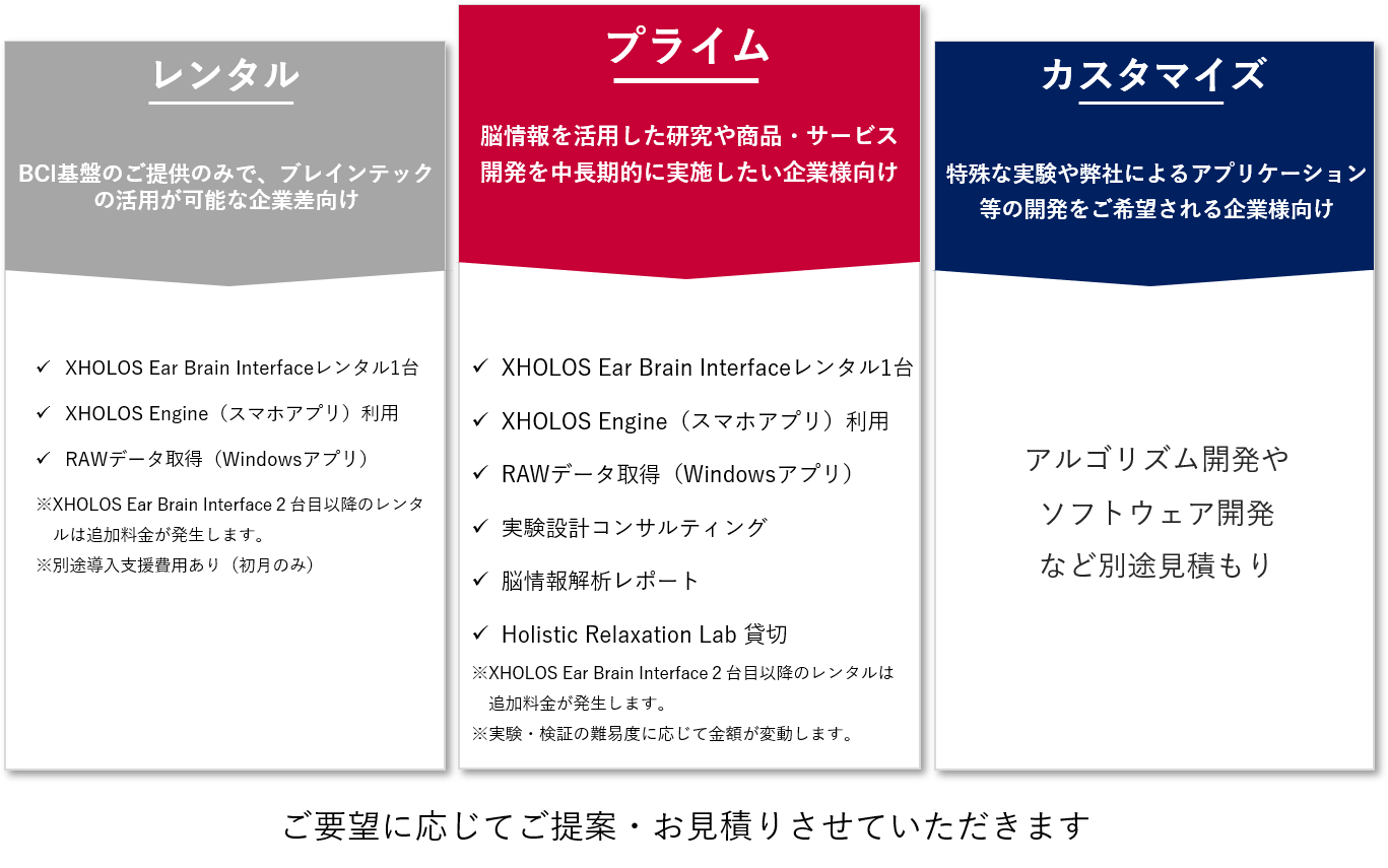 「リラックス計測プラン」のほか「レンタルプラン」、「プライムプラン」、「カスタマイズプラン」の3つのプランがございます。