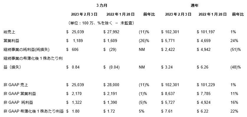 第4四半期の売上高は、前年同期比11%減の250億ドルでした。営業利益は12億ドルで売上高に占める割合は4.7%、非GAAPベースの営業利益は22億ドルで売上高に占める割合は8.7%でした。第4四半期の継続事業の純利益は6億600万ドル、非GAAPベースの純利益は13億ドルでした。営業キャッシュフローは27億ドルでした。継続事業の希薄化後1株あたり利益は0.84ドル、非GAAPベースの希薄化後1株あたり利益は1.80ドルでした。