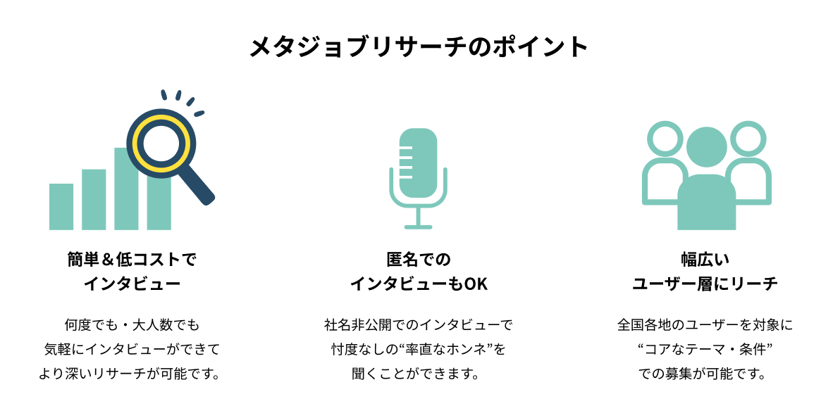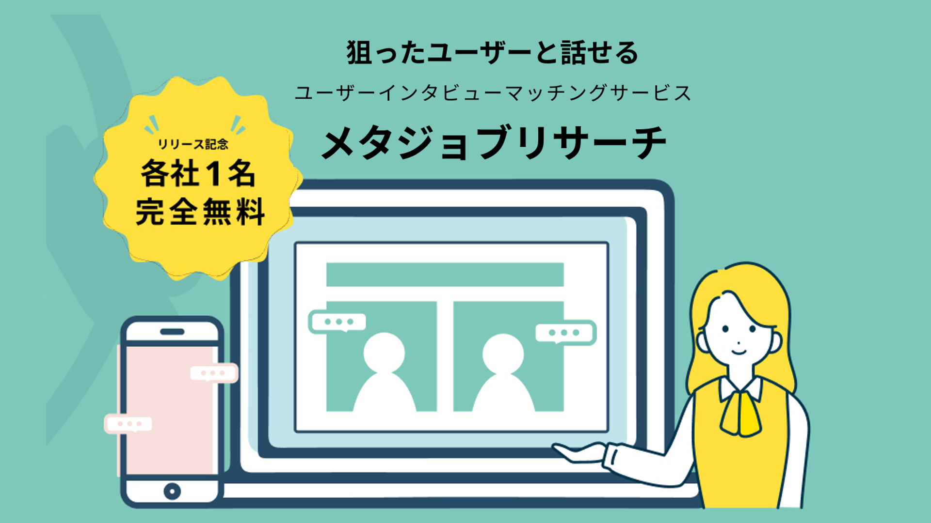 *メタジョブリサーチとは:オンラインインタビューを実施したい企業と、全国のインタビュー対象者を繋ぐ“ユーザーインタビュー用のマッチングサービス”。独自プロダクトによる“スピーディーかつ低コストでのマッチング”が特徴。