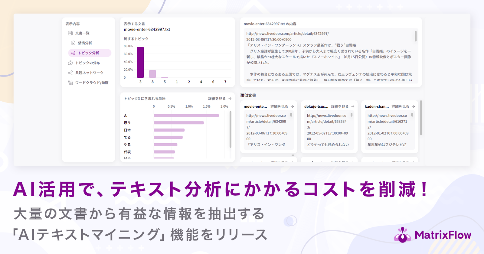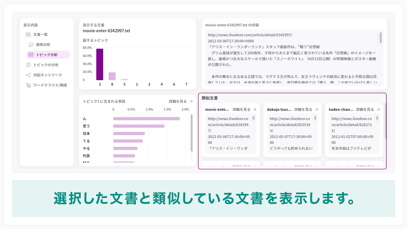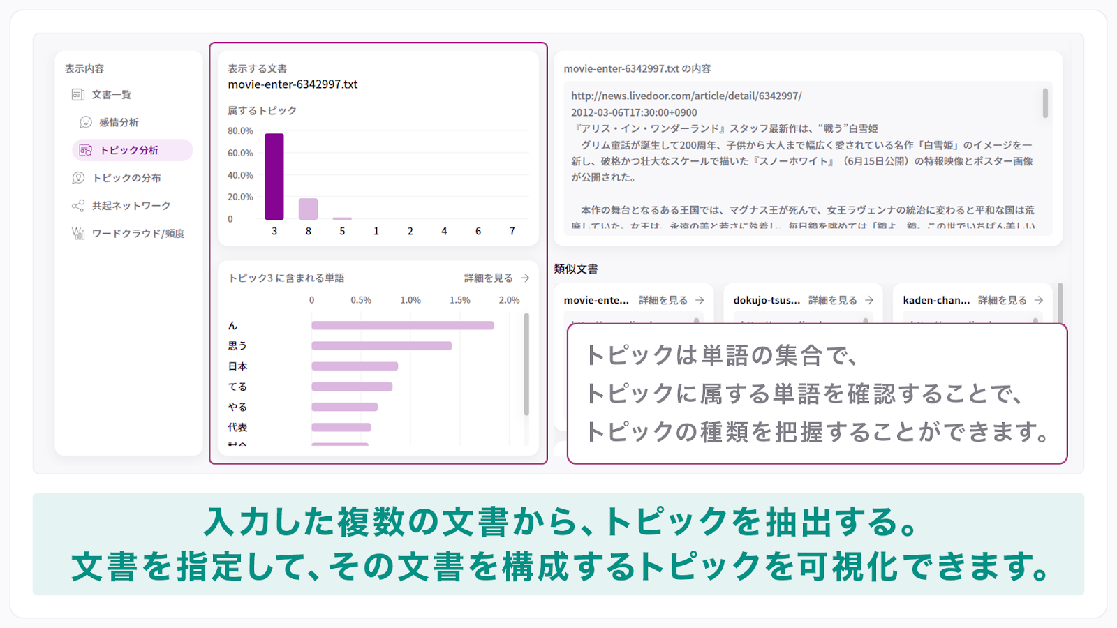 入力した複数の文書を分析し、トピックを抽出します。これにより文書を構成しているトピックを確認したり、トピックを構成している単語を可視化することが可能です。