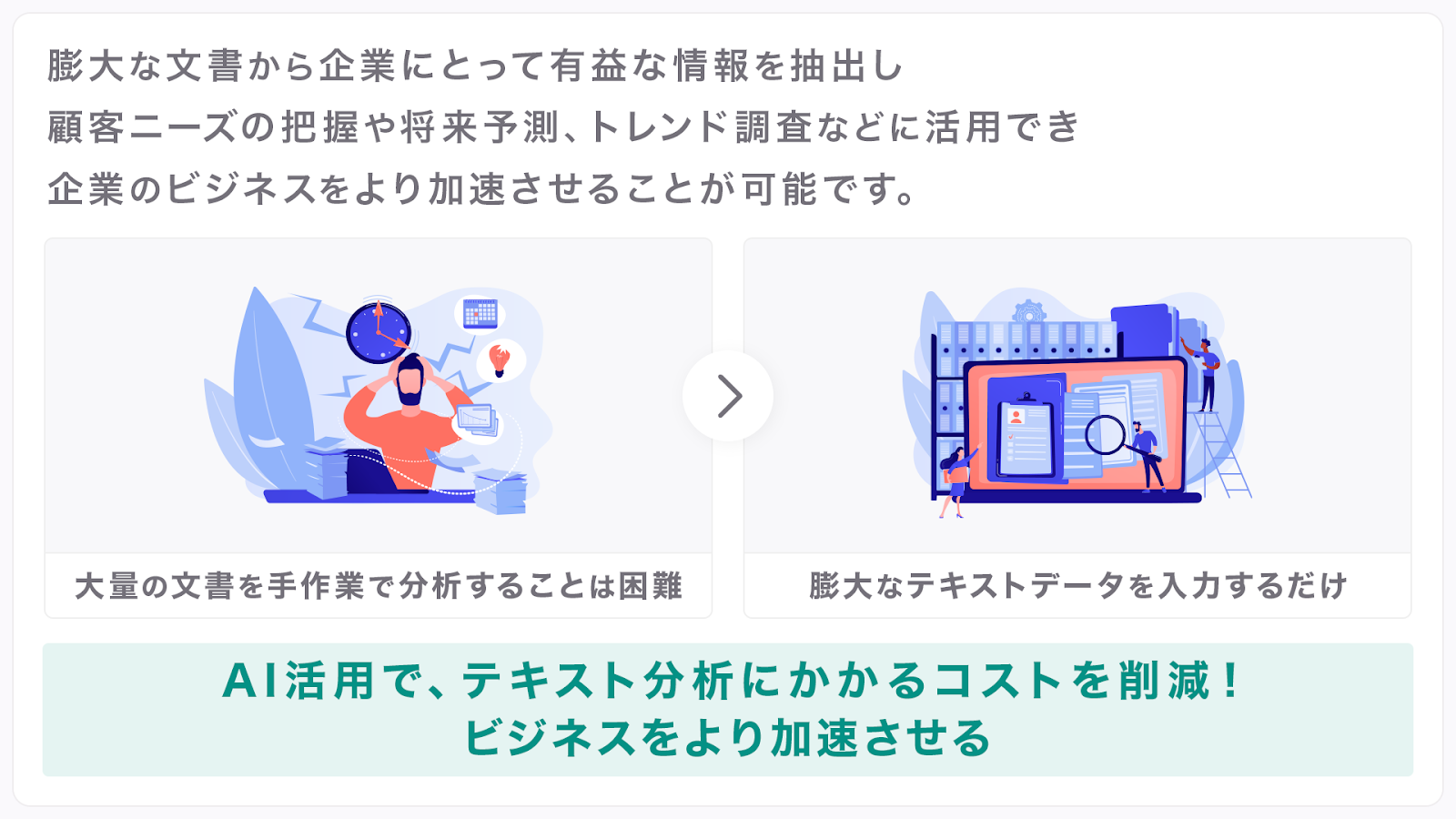 AIテキストマイニングは、アンケートや特許論文、日報などの膨大な文書から企業にとって有益な情報を抽出する機能です。これまで数百、数千万に及ぶ大量の文書を手作業で分析することは手間がかかり、困難な作業でした。しかし、AIテキストマイニング機能を使えば、膨大なテキストデータを入力するだけで自動で分析することができます。これにより、顧客ニーズの把握や将来予測、トレンド調査などに活用し、企業のビジネスをより加速させることが可能です。
