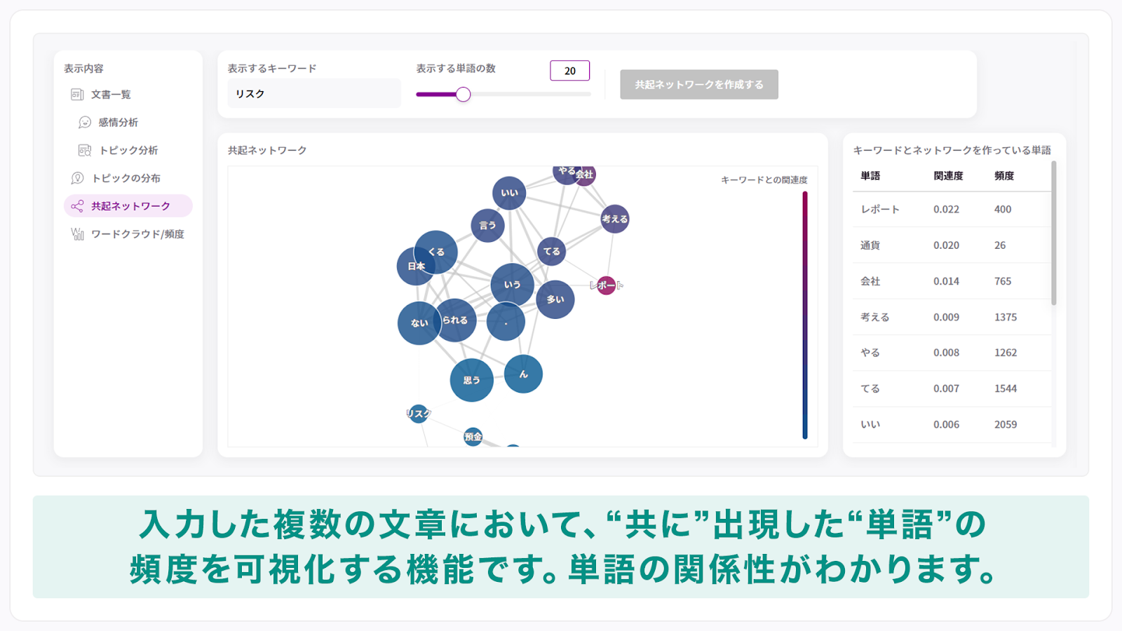 入力した複数の文章において「共」に出現する単語を表示します。また、その出現頻度を円の大きさで可視化することができます。単語の関係性から、文章の特徴を把握することが可能です。