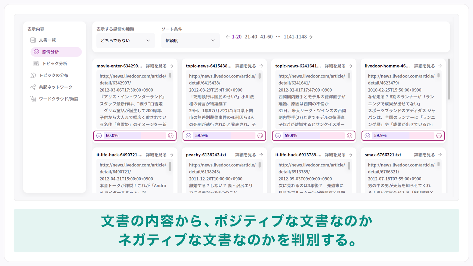 文書に含まれる単語をもとに、ポジティブな内容かネガティブな内容かを判断します。口コミやSNS投稿などの分析を通して、マーケティング施策やカスタマーサポートの品質向上につなげることが可能です。