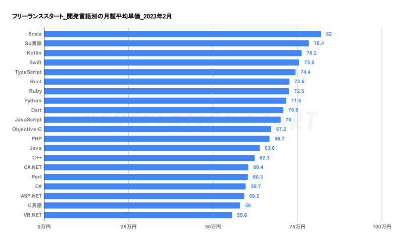 具体的な月額平均単価は1位「Scala」が82.0万円(前月比-1千円・0.12%減)、2位「Go言語」が78.4万円(同+6千円・0.77%増)、3位「Kotlin」が76.2万円(同+1万円・1.33%増)でした。