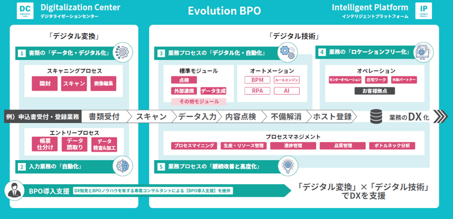 「フルデジタル」「ロケーションフリー」「継続進化型」をコンセプトにした、アグレックスが目指す新しいBPO構想です。高機能スキャナや最新AI-OCRを活用してデジタル変換を行う「Digitalization Center」と、業界・業種を問わず発生する申込や申請などの「受付」から「確認」「登録」などの作業項目を、標準化しシェアード利用を可能にする業界横断型のITプラットフォーム「Intelligent Platform」により、スピーディで簡素化された業務構築と人的作業の最少化に寄与します。