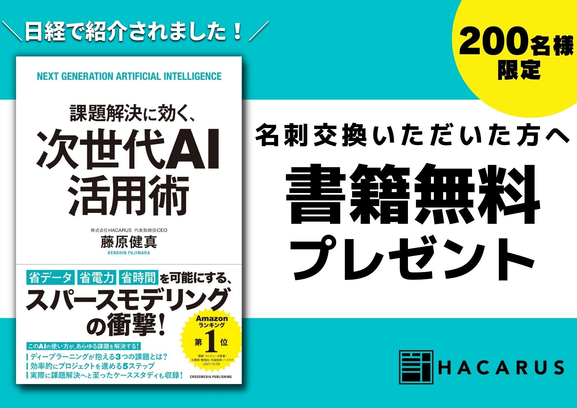 ハカルス代表・藤原健真 執筆の書籍「課題解決に効く、次世代AI活用術」を名刺交換いただいた方先着200名様にプレゼントいたします。Amazonの売れ筋ランキングにて三冠を獲得、日本経済新聞社にも取り上げられた注目の書籍です。ぜひ弊社ブースまでお立ち寄りください。