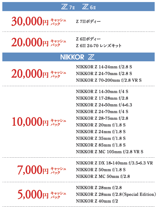 内 容 :対象製品ご購入期間中に対象製品を購入し、ニコンイメージング会員の登録並びに製品登録※の上、所定の応募用紙に必要書類を揃えて応募された方全員に、最大30,000円キャッシュバックいたします。 ※登録は無料です