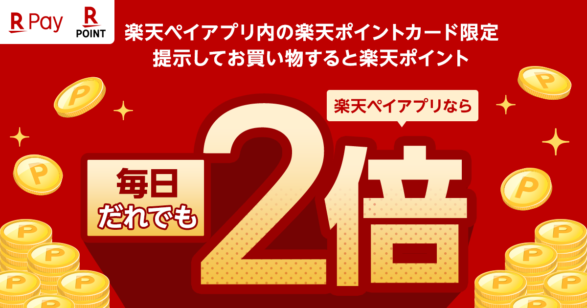 | キャンペーン名称 | 「楽天ペイアプリ内の楽天ポイントカード限定!毎日だれでも楽天ポイント2倍」 |