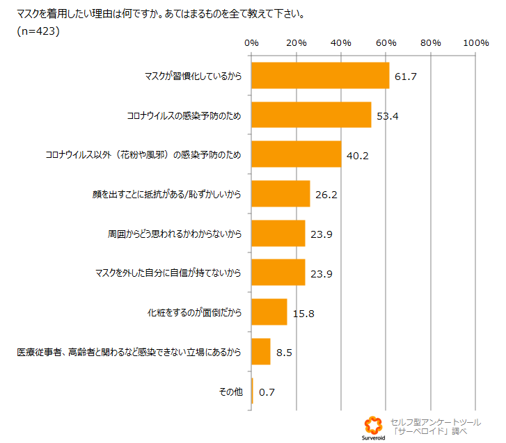 マスクを着用したいと回答した人にその理由を聞いたところ、「マスクが習慣化しているから(61.7%)」が最も多く、次いで「コロナウイルスの感染予防のため(53.4%)」、「コロナウイルス以外(花粉や風邪)の感染予防のため(40.2%)」という結果になり、予防のためより習慣になっているから着用したいと思っている人が多いことがわかりました。