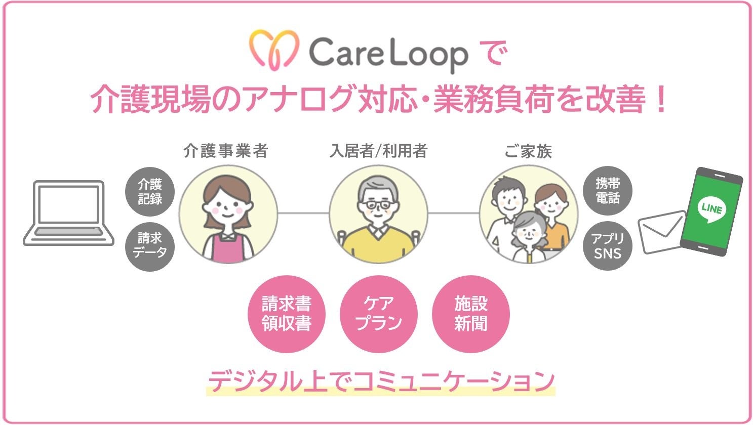 本日リリースいたしました「CareLoop」では、これらの問題を解決するために、様々な機能を搭載して業務をデジタル化することで介護スタッフの負担を軽減し、利用者ご家族様ともLINEやメールを通じてつながることができるサービスです。