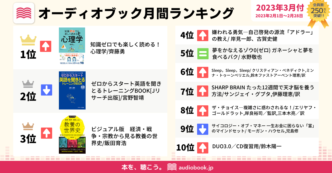 2023年1月の新年に配信開始した新作『SHARP BRAIN たった12週間で天才脳を養う方法』、『ザ・チョイス―複雑さに惑わされるな!』も堂々のランクイン。自己啓発やビジネスカテゴリーをよく聴くビジネスマンに支持されていると推測されます。