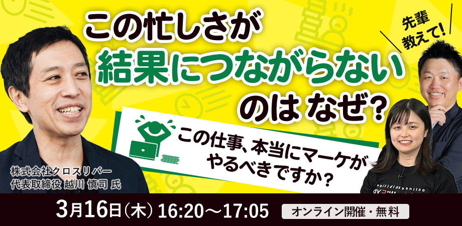 「先輩教えて!この忙しさが結果につながらないのはなぜ? ~この仕事本当にマーケがやるべきですか?~」をテーマとしたセミナーを2023年3月16日(木)に開催いたします。
