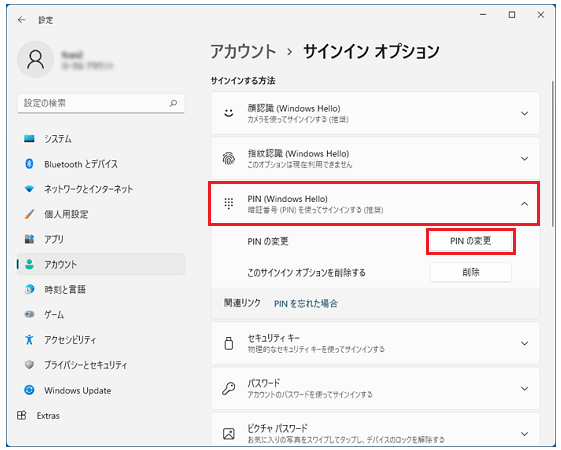Step2:「PIN(Windows Hello)」をクリックし、「PINの変更」をクリックします。