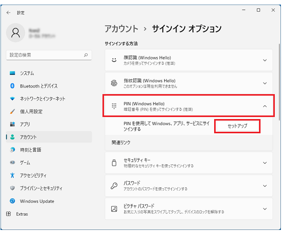 Step2:「PIN(Windows Hello)」をクリックし、「セットアップ」ボタンをクリックします。