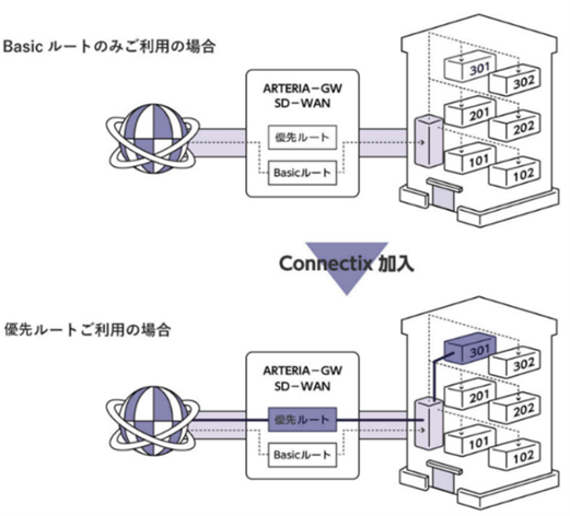 「Connectix」は、SD-WAN技術を活用し、入居者(住戸)ごとに優先ルートによる接続を可能にする通信サービスです(アルテリア・ネットワークス株式会社にて特許取得済、特許第7044450号)。