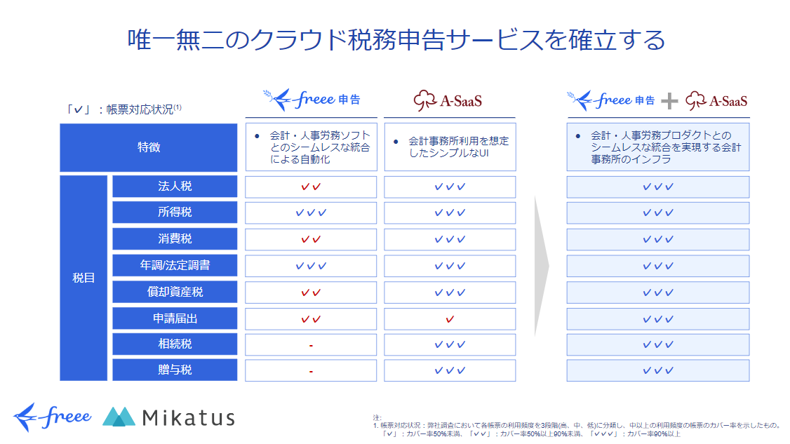今回のグループ参画によりfreeeのサービスに加え、新たにMikatusが運営する税理士のためのクラウド税務・会計・給与システム「A-SaaS(エーサース)」も提供できることで、より多くのスモールビジネスを支える体制となります。また、MikatusがA-SaaSで培ってきたノウハウを迎え入れることで、開発のスピードとサービス安定性の向上を実現し、唯一無二のクラウド税務申告サービスを確立していきます。