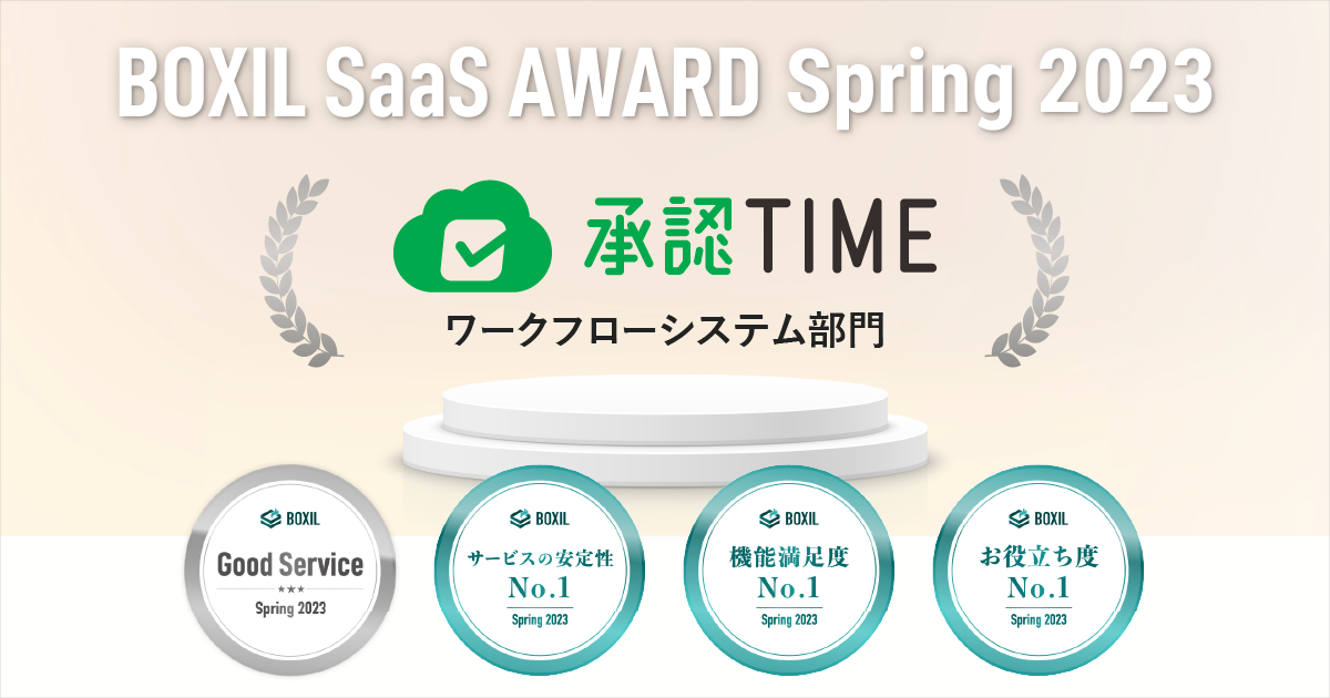 「BOXIL SaaS AWARD(ボクシル サース アワード)」は、SaaS比較サイト「BOXIL SaaS」を運営するスマートキャンプが優れたSaaSを審査、選考、表彰するイベントです。今回の「BOXIL SaaS AWARD Spring 2023」は、2022年1月1日から2022年12月31日までの1年間で新たに投稿された口コミ約14,000件を審査対象としており、「承認TIME」はワークフローシステム部門で「Good Service」に加え、「サービスの安定性No.1」「機能満足度No.1」「お役立ち度No.1」を獲得しました。また、その証としてそれぞれのバッジがスマートキャンプから付与されました。