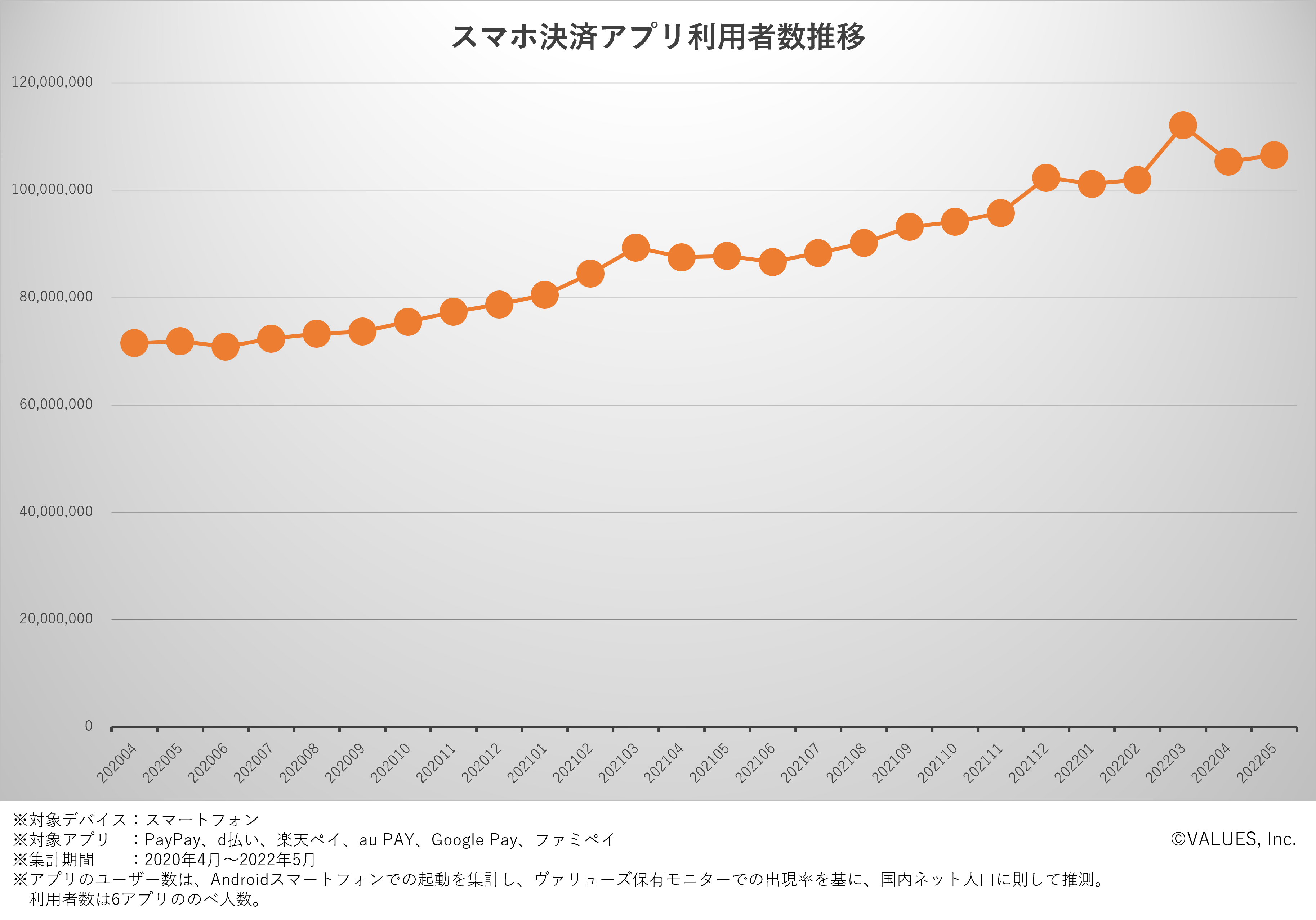 非接触で決済ができることから、新型コロナウイルス感染対策の観点からも注目され利用者が増加したスマホ決済アプリ。今回は主要6アプリ(PayPay、d払い、楽天ペイ、au PAY、Google Pay、ファミペイ)の利用者数合計を月次で調査しました。