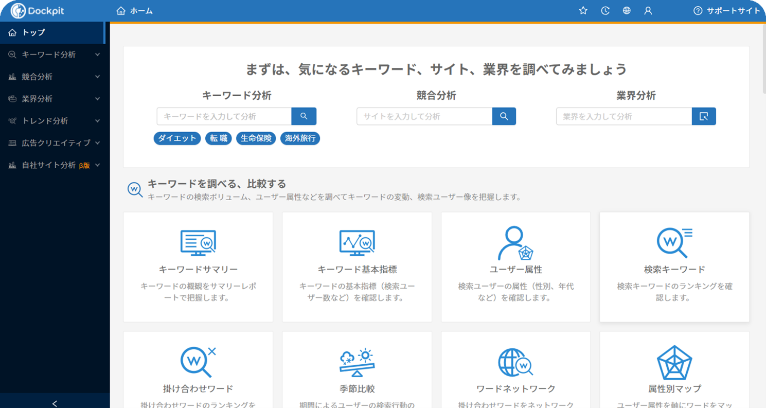 「Dockpit」は、限られた時間でたくさんの情報を必要とするマーケターが、分析したいキーワードやサイトURL、業界を入力するだけで、競合調査、業界分析、トレンド把握を可能にしたマーケティングツールです。
