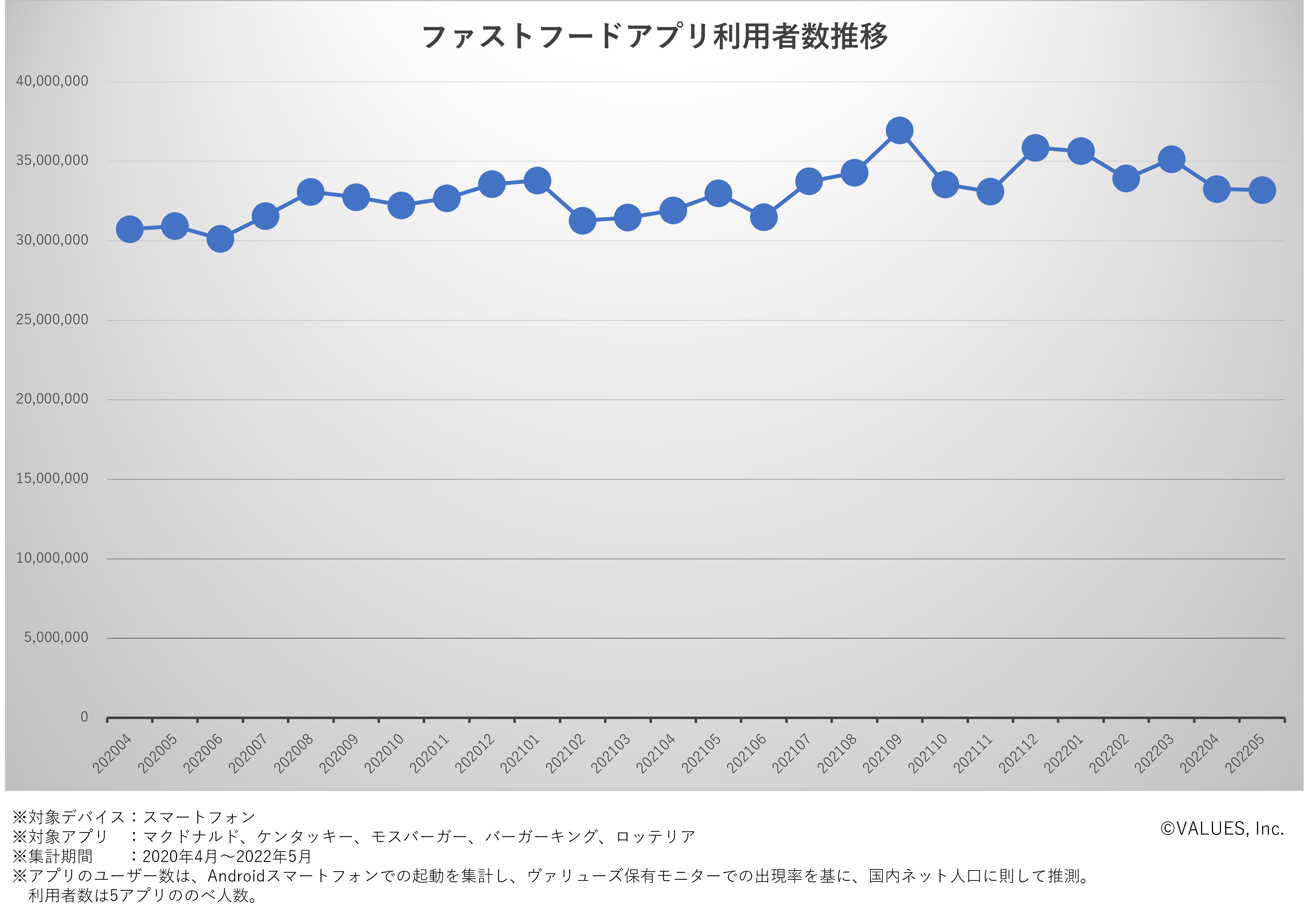 次に、ファストフードの主要5アプリ(マクドナルド、ケンタッキー、モスバーガー、バーガーキング、ロッテリア)の利用者数合計を月次で調査しました。
